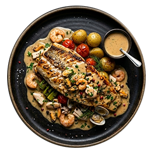 Una opción más ligera pero muy sabrosa. Consiste en un filete de abadejo fresco cocinado en su punto justo, generalmente bañado en una salsa cremosa de mariscos que realza el sabor del pescado blanco, acompañado de papas al natural o verduras asadas.